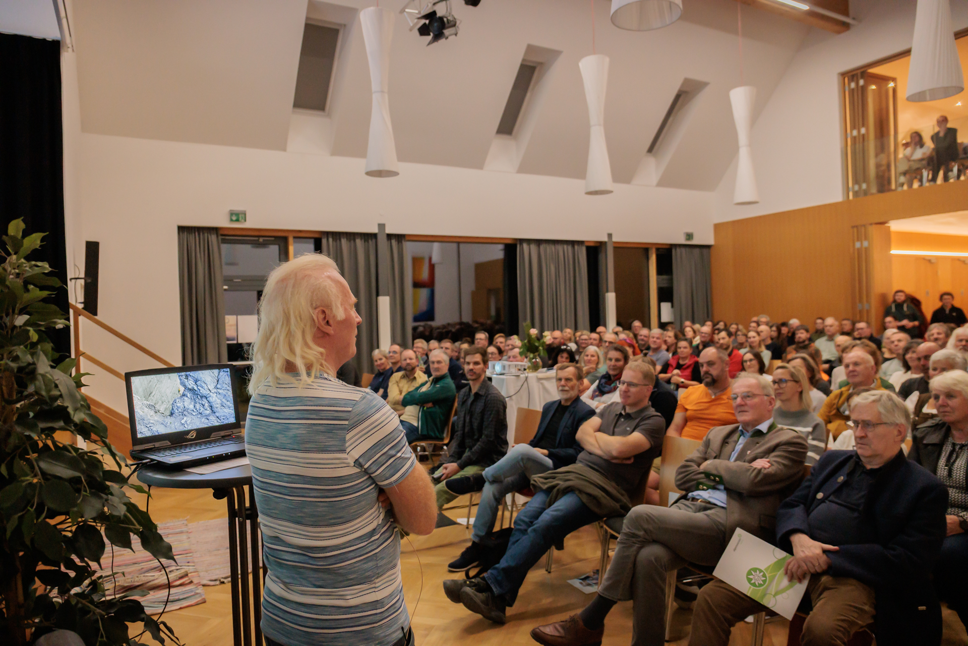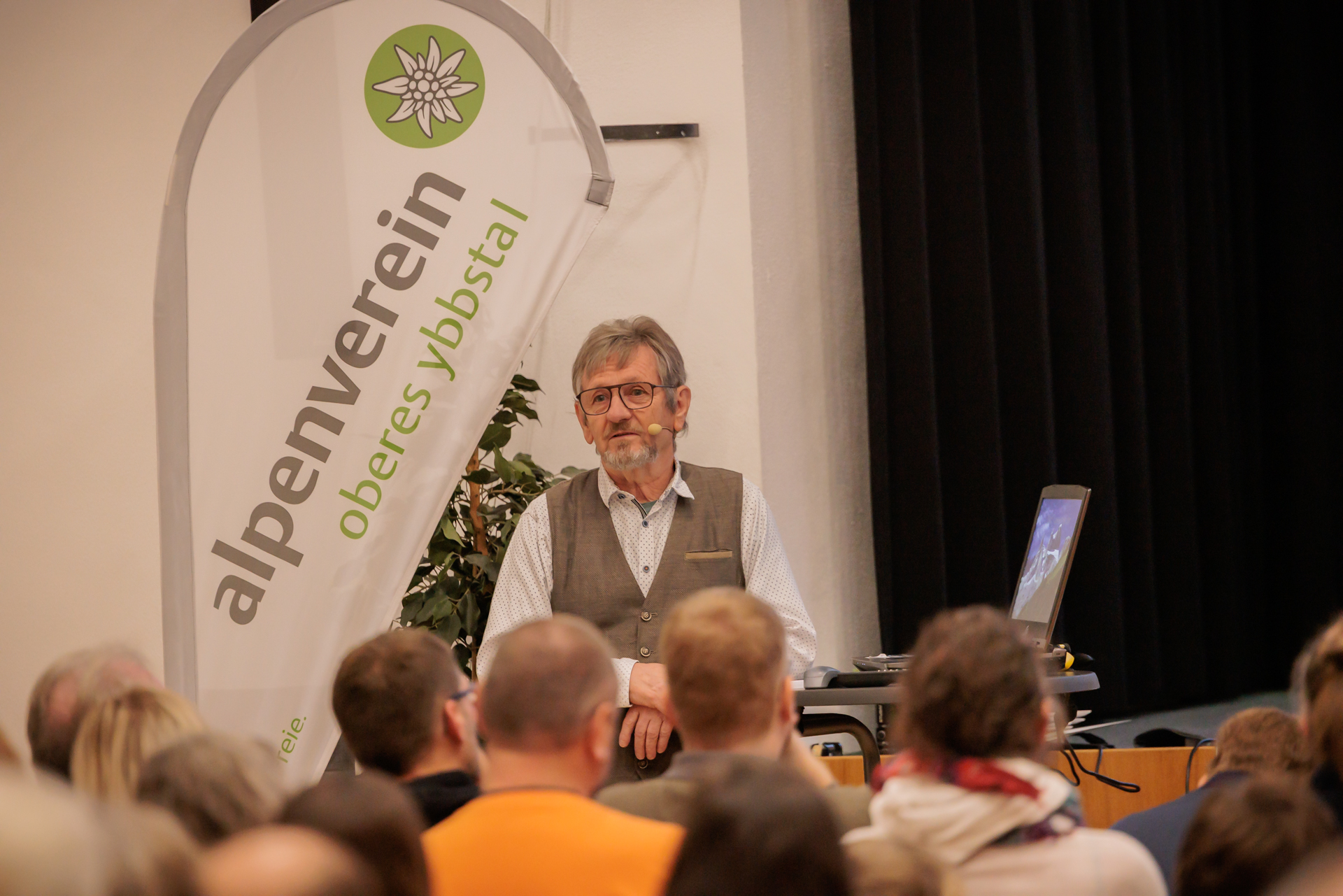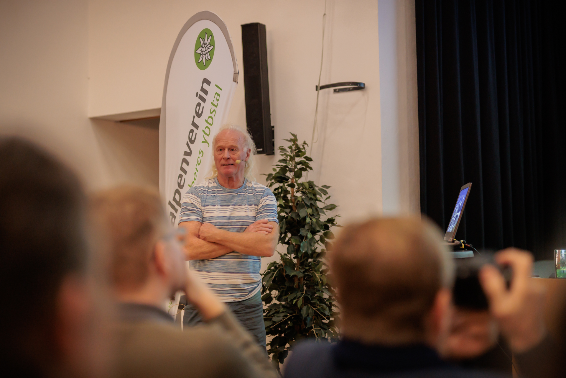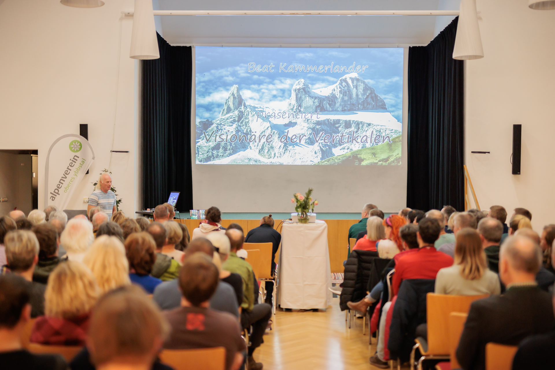 Dann war es Zeit für den mit Spannung erwarteten Vortrag: Beat Kammerlander begeisterte das Publikum mit eindrucksvollen Bildern, persönlichen Geschichten und tiefen Einblicken in seine außergewöhnliche Kletterkarriere. Mit seiner ruhigen, authentischen Art nahm er die Zuhörer mit auf eine Reise an steile Felswände und zu Momenten, in denen Mut, Kreativität und mentale Stärke entscheidend waren.