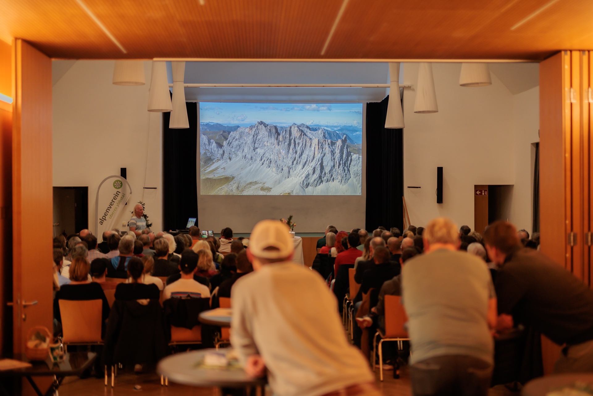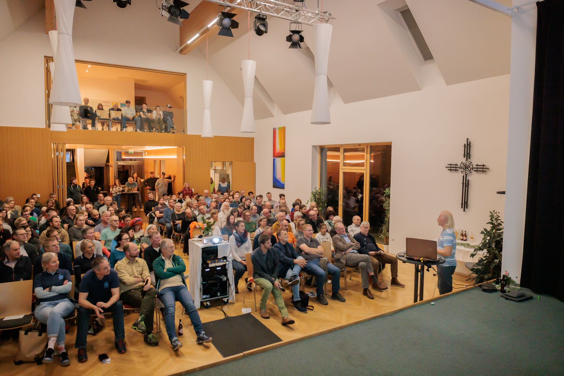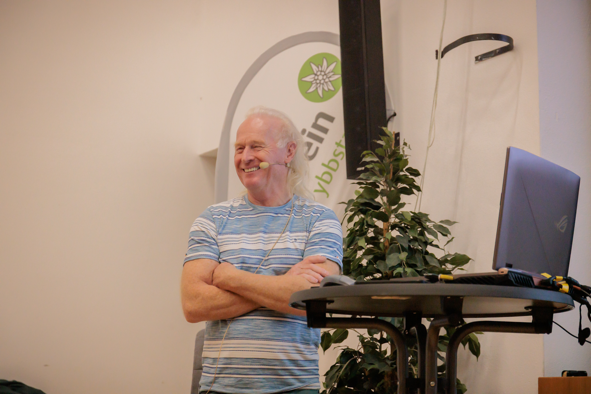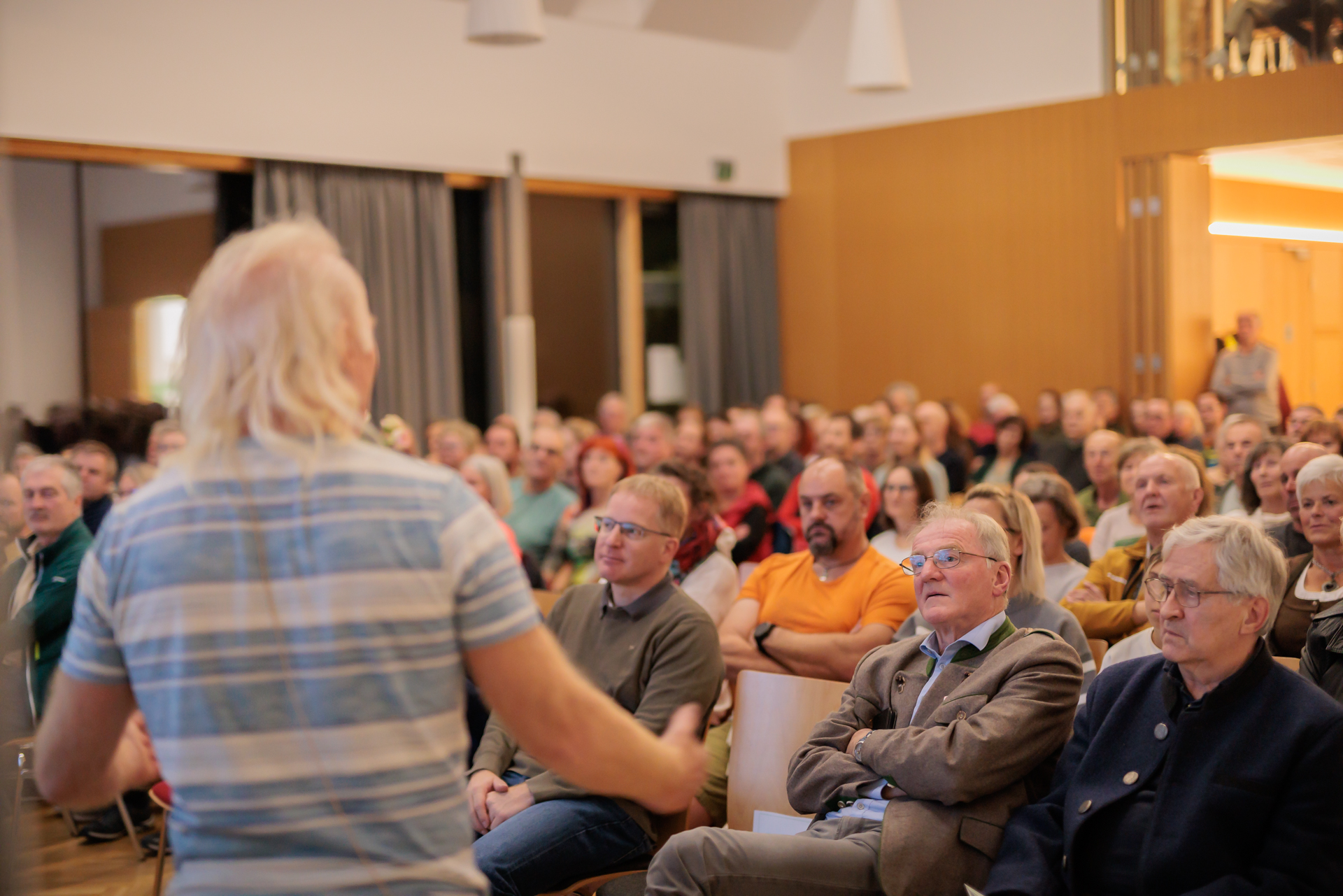 Dann war es Zeit für den mit Spannung erwarteten Vortrag: Beat Kammerlander begeisterte das Publikum mit eindrucksvollen Bildern, persönlichen Geschichten und tiefen Einblicken in seine außergewöhnliche Kletterkarriere. Mit seiner ruhigen, authentischen Art nahm er die Zuhörer mit auf eine Reise an steile Felswände und zu Momenten, in denen Mut, Kreativität und mentale Stärke entscheidend waren.