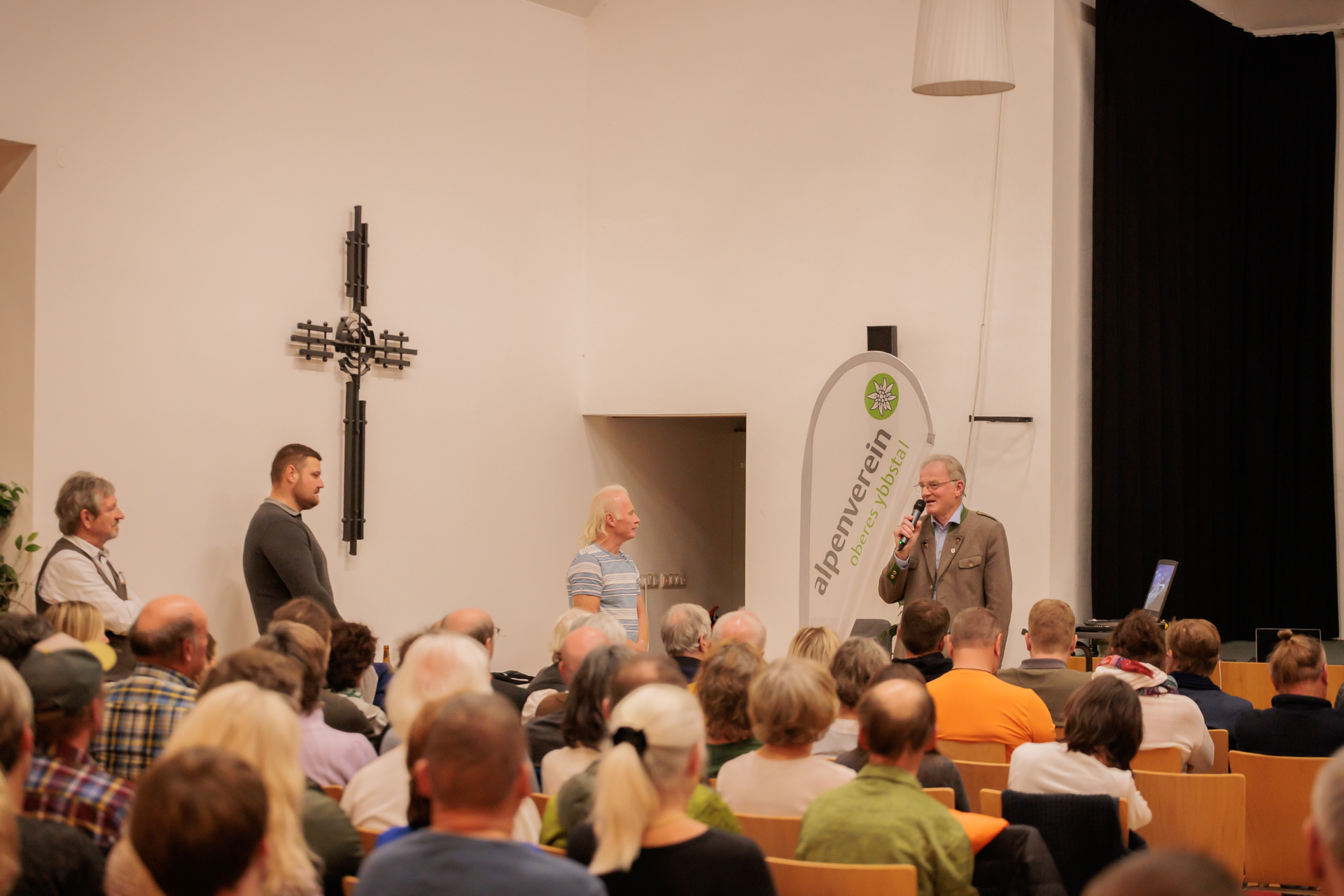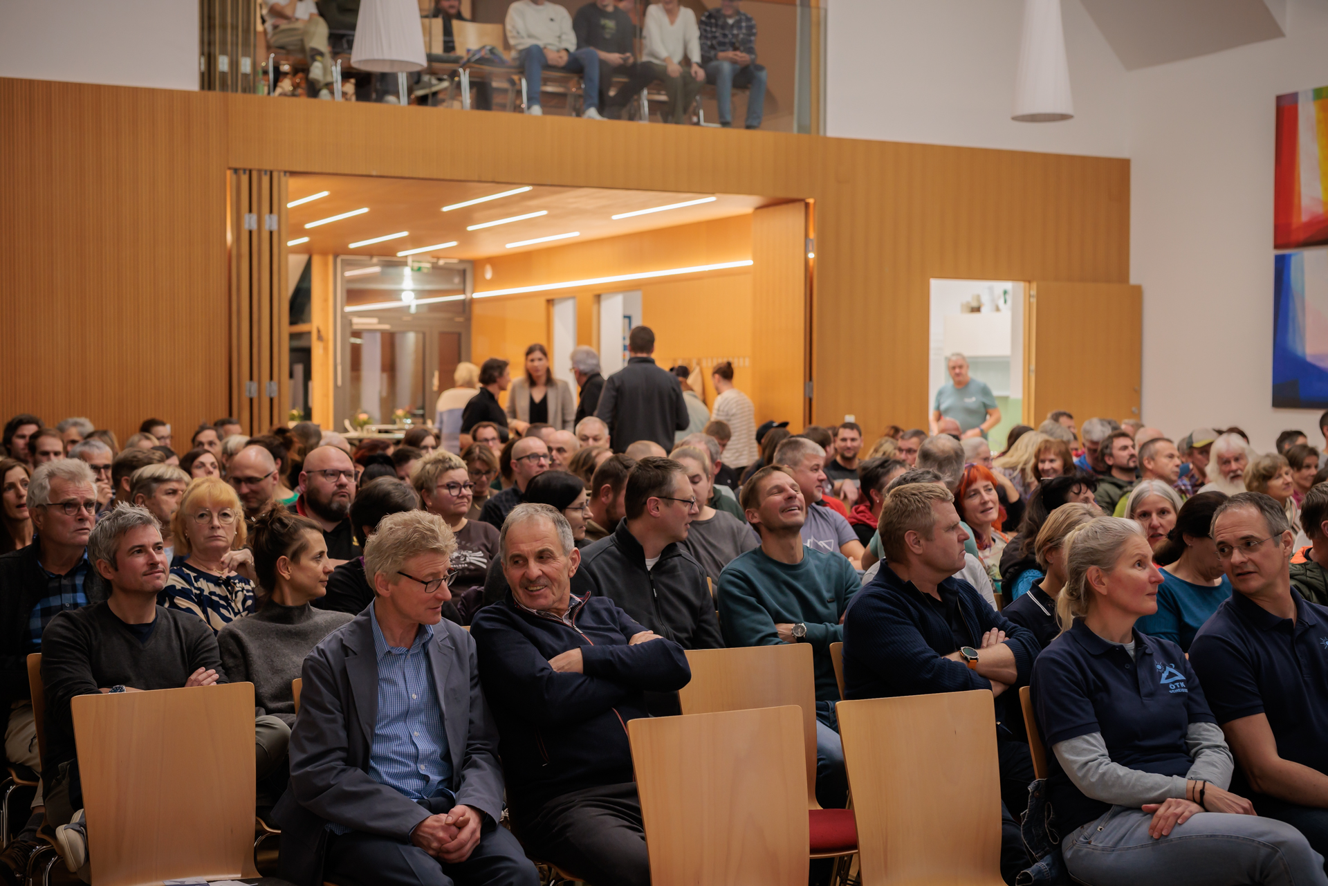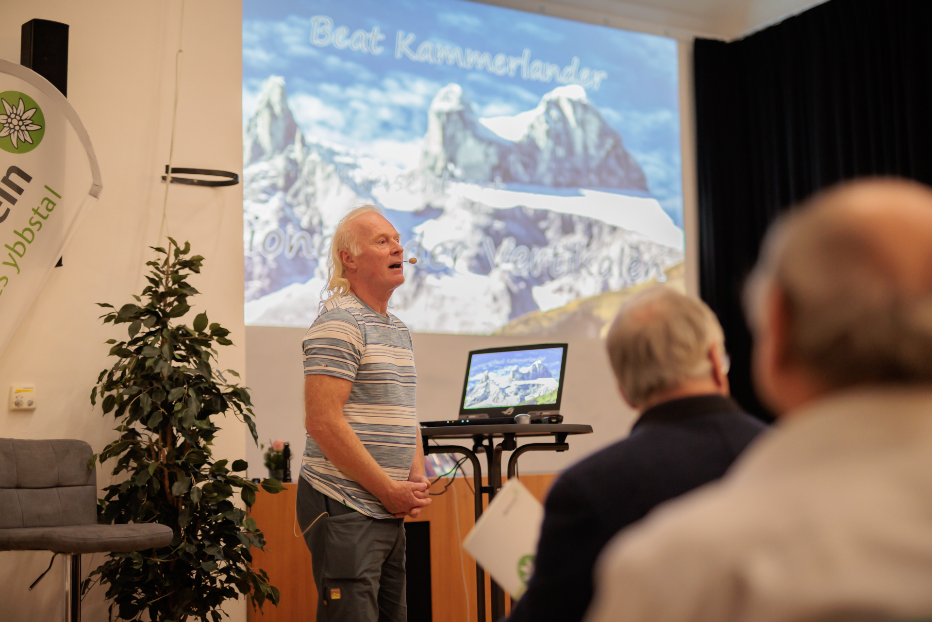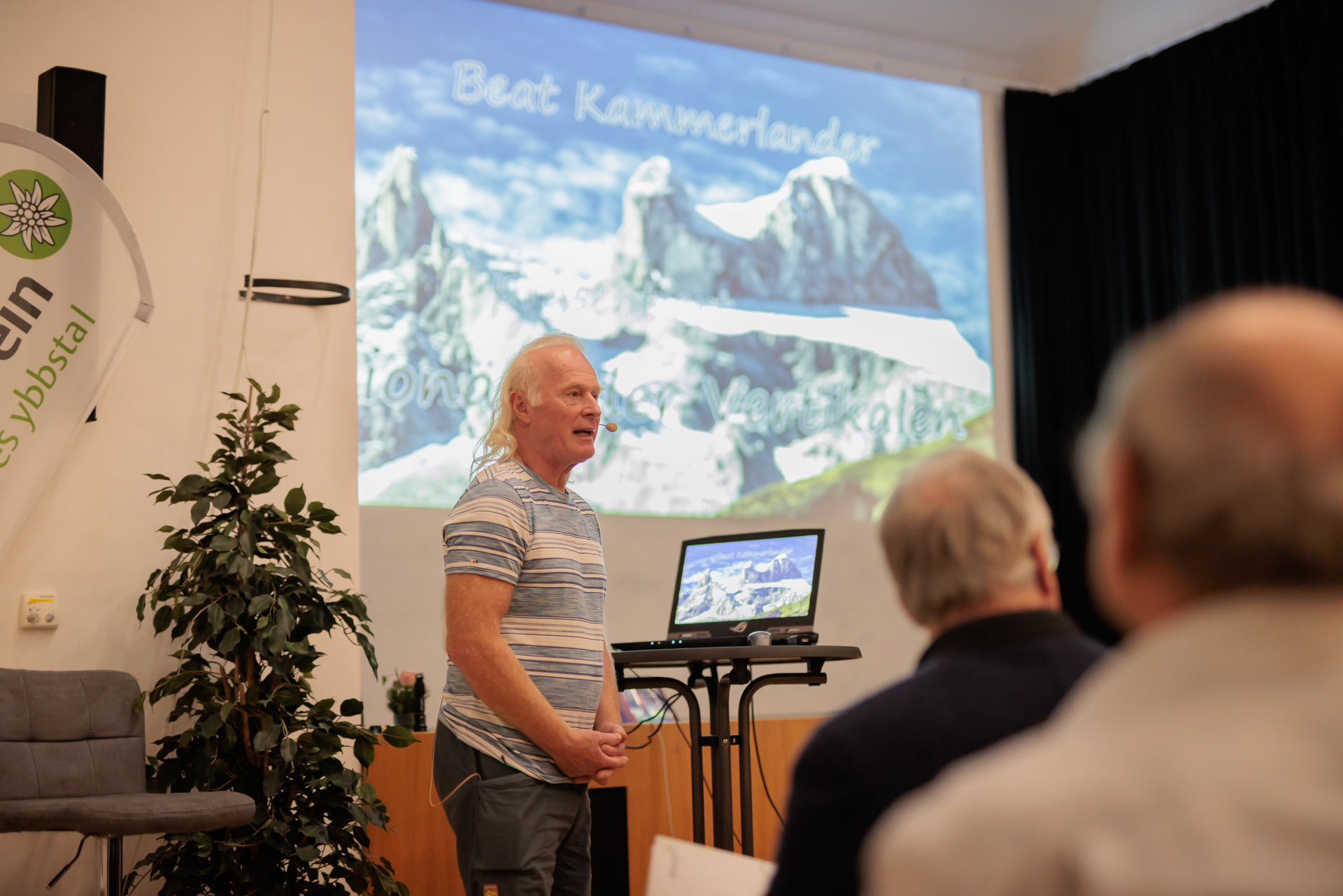 Dann war es Zeit für den mit Spannung erwarteten Vortrag: Beat Kammerlander begeisterte das Publikum mit eindrucksvollen Bildern, persönlichen Geschichten und tiefen Einblicken in seine außergewöhnliche Kletterkarriere. Mit seiner ruhigen, authentischen Art nahm er die Zuhörer mit auf eine Reise an steile Felswände und zu Momenten, in denen Mut, Kreativität und mentale Stärke entscheidend waren.